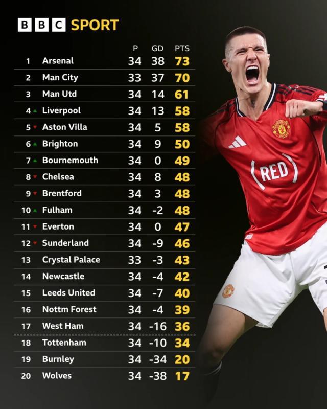 今晨英超第34轮最后一场,曼联主场2比1击败布伦特福德。红魔目前积61分,暂列积分榜第3,在联赛仅剩4轮的情况下,领先第6名布莱顿11分,欧冠资格基本到手。